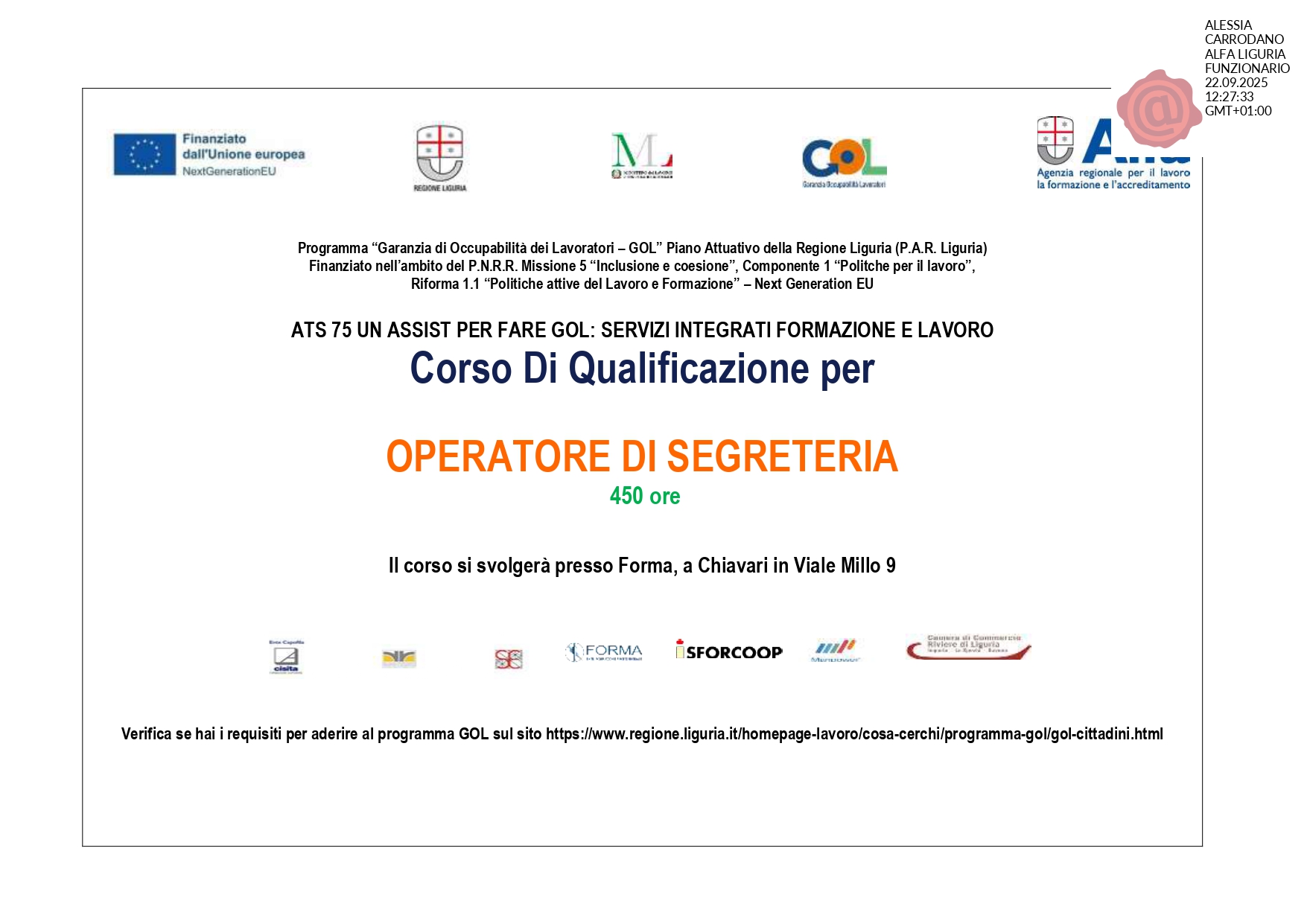 Corso completamente gratuito perchè finanziato dal Programma GOL attraverso il PNRR